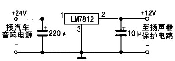 具體制作如下:先把功放輸出端與音箱的引線切斷,按圖2所示電路將引線頭a、b分別接功放的兩組輸出端,c、d分別接左、右聲道音箱:揚聲器保護電路的電源只能從收放機中獲取,不可直接從汽車12 v電源中獲取,否則不起開/關機保護作用;若是柴油車所配置的收放機(使用24 V電源),則要求增加一個降壓電路(見圖3所示),給揚聲器保護電路供電,以免電源電壓過高損壞IC。