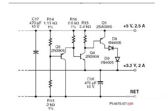 5V輸出端與3.3V輸出端的標準差異為1.7V。當負載要求從3.3V輸出端獲得額外的電流,而從5V輸出端輸出的負載電流并未等量增加時,其輸出電壓與3.3V輸出端的電壓相比將會升高。由于電壓差異約超過100 mV,Q5將偏置截止,從而導通Q4和Q1并允許電流從5V輸出端流到3.3V輸出端。該電流將降低5V輸出端的電壓,進而縮小兩個輸出端之間的電壓差異。