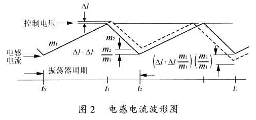 在圖l所示的電路中,當電源的占空比大于50%,或變壓器工作在連續電流條件下時,整個電路就會產生分諧波振蕩,引起電源輸出的不穩定。圖2表示了變壓器中電感電流的變化過程。沒在t0時刻,開關開始導通,使電感電流以斜率m1上升,該斜率是輸入電壓除以電感的函數。t1時刻,電流取樣輸入達到由控制電壓建立的門限,這導致開關斷開,電流以斜率m2衰減,直至下一個振蕩周期。如果此時有一個擾動加到控制電壓上,那么它將產生一個△I,這樣我們就會發現電路存在著不穩定的情況,即在一個固定的振蕩器周期內,電流衰減時閘減少,最小電流開關接通時刻t2上升了△I+△Im2/m1,最小電流在下一個周期t3減小到(△I+△Im2/m4)(m2/m1),在每一個后續周期,該擾動m2/m1被相乘,在開關接通時交替增加和減小電感電流,也許需要幾個振蕩器周期才能使電感電流為零,使過程重新開始,如果m2/m1大于l,將會不穩定。因此,圖l所示的電路在某狀態下存在著一定的失穩隱患。