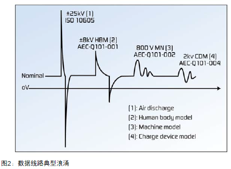 圖2顯示數據線路上產生的瞬態主要是ESD浪涌。盡管此類浪涌為低能量,但是會產生強大的電磁場。