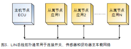 LIN總線拓撲利用一臺獨立主機或ECU(電子控制單元)以及多個節點,如圖3所示。連接應用模塊至車載網絡使其可進行診斷和提供服務。