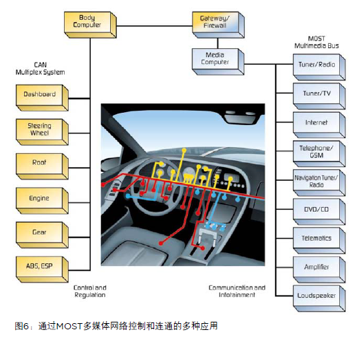 實際上,MOST是一個節點網絡,用于傳輸車載多媒體和信息娛樂系統中出現的各種不同信號和數據流。MOST標準支持多種物理接口,如圖6所示。MOST標準中,這些應用可參考功能塊。每個功能塊包括幾種功能(如一個CD播放器可以包括播放、停止、彈出和播放時間等功能)。