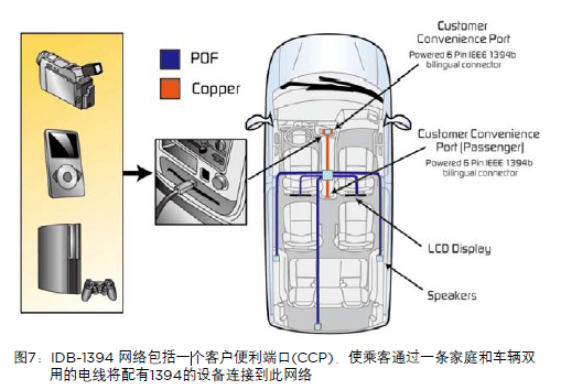 IDB-1394車載結構可分為內置網絡和客戶便利端口,簡稱CCP,如圖7所示。該標準顯示了一種類似于現有MOST標準的一種內置塑料光纖(POF)車載網絡。然后,該網絡更加穩固且更易使用。多種電子元件可以連接到此網絡,如DVD播放器、視屏顯示器、導航系統、無線電主機以及通訊設備。