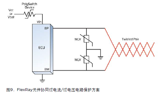 FlexRay協議專為線控應用所設計,如線控剎車和線控方向盤。該線控網絡方式支持同步和異步數據傳輸,數據傳輸率約為10Mb/s,具有時間觸發和事件觸發行為、冗位和容錯的特點。該結構支持一“束”2個節點至64個節點,其功能主要依靠于兩種類型的處理器—ECU和“活動星”。FlexRay通訊通過一個常用總線或一個星形連接在ECU之間進行。FlexRay元件的總線輸入必須避免在總線路和系統供電電壓或地電位之間出現短路現象。圖9顯示了ECU的調整后過電流/過電壓保護方案。該方案利用一個PolySwitch設備進行過電流保護,以及兩個傳統表面安裝結構的MLV進行ESD和瞬間過電壓保護。