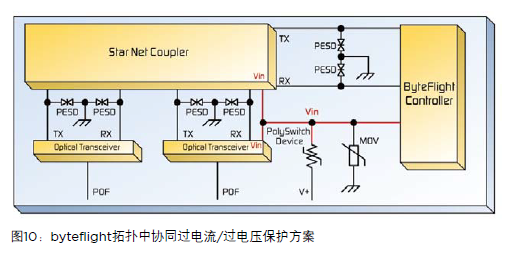 byteflight協議是一個車載數據總線,為提供車載元件之間進行非常安全且容錯的電子通訊手段而開發。byteflight在總線、星形或集群配置中通過2線或3線塑料光纖(POF)達到10Mbps以上的速度。該系統結構中使用POF使其功能能夠在數據方面達到電氣上的獨立。然而,節點仍然從車載供電總線處獲得電流,而且會受到電磁干擾的影響。構成該網絡的元件,如微處理器、byteflight控制器和光收發器,容易因供電尖峰和反向電壓而受到損傷。集成電路(ICs)或許包括ESD保護,但是通常限制在2kV以下。如圖10所示,PolySwitch設備和MLV可以保護這些模塊不受高能量過電壓和過電流瞬態的影響而產生損傷。