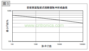 一旦確定了應用波形的I2t值,它必須根據系統壽命中的預期循環次數折減。由于電流脈沖導致的應力本質上是機械作用力,受力次數對保險絲折減程度具有重要影響。圖5給出了TE Connectivity表面貼裝式保險絲在十萬次循環內的電流脈沖折減曲線。