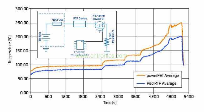 如圖4所示,當RTP器件靠近powerFET安裝時,它能夠追蹤FET溫度。當FET超過正常工作溫度極限并出現過溫情況時,RTP器件將激活,并斷開電源線路。