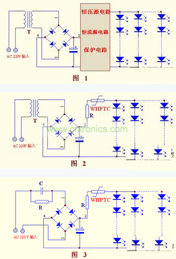 如果用WHPTC過流保護器作保護,將是另外一種結果,從原理可知,當電路的電流超過規(guī)定值時會訊速的自動保護,在排除故障后又自動復位,無需人工更換。對LED而言,電壓的變化不是LED損壞的直接原因,而電流的增大才是LED的真正殺手。顯而易見,利用WHPTC的這個特性,在LED的電路保護上具有絕對的優(yōu)勢,讓簡易電源供電變?yōu)楝F(xiàn)實。實踐證明,在LED電路出現(xiàn)故障以前就有效保護了。在簡易電源上,這個優(yōu)勢特別突出。對如下3圖分析可見,因有了WHPTC后可省去恒流、恒壓電路, LED的質量也提高了。器件成本、生產(chǎn)成本、故障率、服務成本等,都大大降低。也大大增加了產(chǎn)品的市場競爭力。所以誰先使用WHPTC,誰先占領市場。