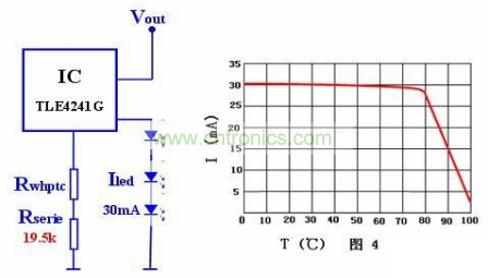 圖3所示電路闡明了LED電流(參見圖3)的溫度依賴性。與針對最高運行溫度為60度的恒流源相比較,使用PTC熱敏電阻后LED電流可在0度和40度之間提升達40%,并且LED亮度也能提高同等百分比。