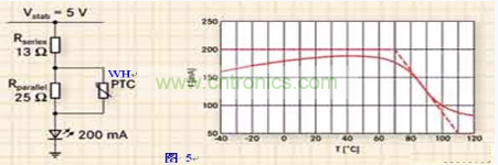 由于LED電流的絕大部分流經(jīng)PTC熱敏電阻本身,因此需要選擇一個較大的徑向引線式元件。PTC將因為流經(jīng)電阻本身的電流而導致發(fā)熱,因此會一直減少電流,無論環(huán)境溫度為何(如圖5所示)。并聯(lián)兩個或更多片式PTC熱敏電阻會將電流分流,但此方案仍存在局限性。