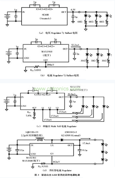 圖3(b)中的MAX1910屬于定電流輸出型的電壓ReguLator,雖然本電路使用同廠商、同批號(Lot)的白光LED,獲得了極佳的匹配性,不過,在使用不同廠商與批號的LED時,就會出現(xiàn)很大的特性差異分布。本電流Regu-Lator使用類似圖3(a)的方式控制驅動電流,不過它卻可以使BaLLast電阻的消費電力降低一半左右。
