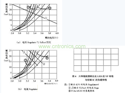 圖3是驅動白光LED常用的四種電源電路;圖4是上述六種隨機取樣白光LED穩(wěn)定后的ReguLation精度特性。