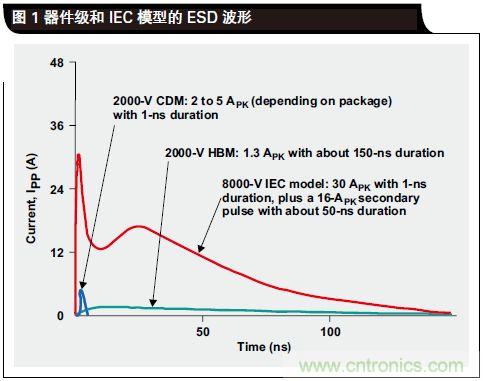 2、另一個(gè)差異存在于電壓尖峰上升時(shí)間。HBM 的規(guī)定上升時(shí)間為 25ns。IEC 模型脈沖上升時(shí)間小于 1ns,其在最初3ns 消耗掉大部分能量。如果 HBM 額定的器件需 25ns 來做出響應(yīng),則在其保護(hù)電路激活以前器件就已被損壞。