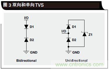 立即沿這條通路接地。在單向 TVS 情況下,只要 D2 和Z1 都不進(jìn)入其擊穿區(qū)域,則電壓信號(hào)會(huì)在接地電壓以上擺動(dòng)。當(dāng)正ESD電擊擊中I/O線路時(shí),D1變?yōu)檎蚱茫鳽1 先于 D2 進(jìn)入其擊穿區(qū)域;通過 D1 和 Z1 形成一條接地通路,從而讓 ESD 能量得到耗散。當(dāng)發(fā)生負(fù)ESD 事件時(shí),D2 變?yōu)檎蚱茫珽SD能量通過 D2接地通路得到耗散。由于 D1 和 D2 尺寸可以更小、寄生電容更少,單向二極管可用于許多高速應(yīng)用;D1 和 D2 可以“隱藏”更大的齊納二極管 Z1(大尺寸的原因是處理擊穿區(qū)域更多的電流)。