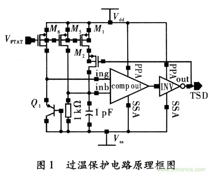 圖1為本設計的原理架構,Q1為NWELLCMOS工藝中寄生PNP三極管,其集電極是必須與地點位連接,為了利用寄生PN結導通正向?qū)妷旱呢摐囟忍匦?,把Q1做二極管連接(基集也接到地),這樣A點和地之間的電壓VA就具有了PN結正向電壓的與溫度成反比的性質(zhì)。由于基準電路輸出的偏置電壓加在M0、M1、M5的柵極上,則其所在支路上都會產(chǎn)生PTAT電流(Proportional to Abso-lute Temperature);在提供偏置的同時,也在電阻R0上產(chǎn)生了與溫度成正比的電壓VB即B點電壓隨之增大。當達到某一溫度TH(設定的關斷溫度)后,VH≥VA、比較器Comp輸出高電平,經(jīng)過倒相器INV后,輸出TSD為低電平;此信號作用于電路的其它模塊后,使整個芯片停止工作,實現(xiàn)熱保護功能。同時,TSD信號正反饋作用于M2柵上,開啟M2,加大了電阻R0上電流,使VB更高。