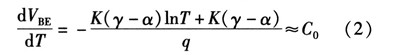 式中VG為帶隙電壓,γ和α為器件參數(shù),A代表了那些方程推到過程中與溫度無關的常量。因為Vt=kt/q,可以得到VBE隨溫度上升是降低的。其關于溫度變化的方程為