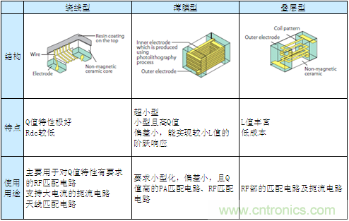 疊層型構造雖有3種結構且Q值也較低,但由于其L值偏差及規(guī)格、價格等整體的平衡性較好,因此被廣泛使用于RF的匹配電路、共振電路及扼流電路中。