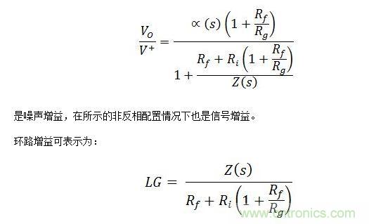 這對于理想的CFB[Ri=0]來說,是一個非常重要的公式,因為它表明了環路增益與反饋電阻的比例關系,因此反饋電阻可作為CFB的主要補償。事實上,增加反饋電阻及帶寬(BW),不僅會降低反饋電阻,同時還可增大帶寬。實際上,不可能將反饋電阻降低到特定值以下,否則放大器會發生振蕩。