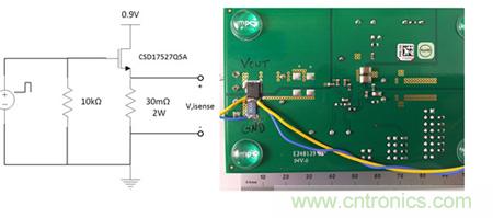 大多數(shù)電源評估模塊可以很容易地被配置為快速汲入電流的模式。圖1舉例說明了分立金屬氧化物半導(dǎo)體場效應(yīng)晶體管(MOSFET)加可直接從輸出平面焊接到接地裝置的檢測