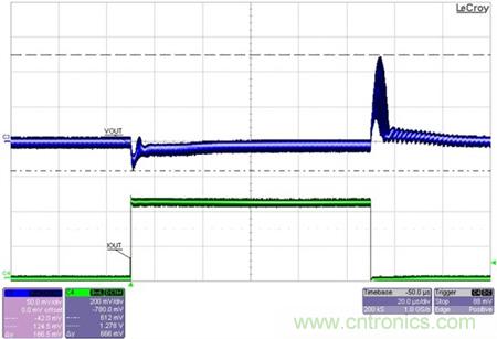 圖3展示了對0.9V輸出(被15A的負(fù)載階躍以300A/us的速率擾動)的瞬態(tài)響應(yīng)。