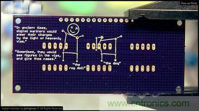下面是一位自稱“johngineer”的網友作品,這家伙的網站有不少很酷的東西(例如一只他自 己做的超酷龐克風手表),還有非常專業的技術文章。“johngineer”沒有解釋這個電路板的作用,但他在上面印了兩段文字,想象未來如果有考古學家挖到這片電路板,會怎么解讀這種“文物”?