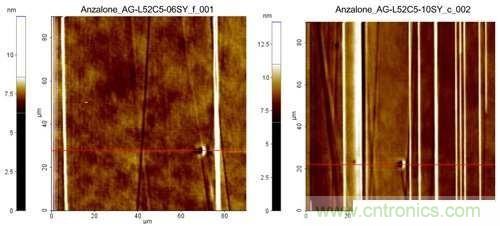 我們發現,氫氣蝕刻制程可以改進表面形貌,但同時也在外延層上引起不同類型的微階褶(SB)和整體階褶現象。AFM表面粗糙度分析表明,階褶會影響對樣品表面均勻性。兩個樣品都顯示一個約6nm高、1μm寬的階褶。圖3顯示了x0.5(左圖)和x3(右圖)樣品在階褶密度上存在明顯差異。