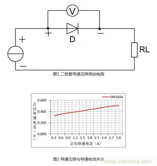 在二極管兩端加正向偏置電壓時,其內(nèi)部電場區(qū)域變窄,可以有較大的正向擴散電流通過PN結(jié)。只有當(dāng)正向電壓達(dá)到某一數(shù)值(這一數(shù)值稱為“門檻電壓”,鍺管約為0.2V,硅管約為0.6V)以后,二極管才能真正導(dǎo)通。但二極管的導(dǎo)通壓降是恒定不變的嗎?它與正向擴散電流又存在什么樣的關(guān)系?通過下圖1的測試電路在常溫下對型號為SM360A的二極管進行導(dǎo)通電流與導(dǎo)通壓降的關(guān)系測試,可得到如圖2所示的曲線關(guān)系:正向?qū)▔航蹬c導(dǎo)通電流成正比,其浮動壓差為0.2V。從輕載導(dǎo)通電流到額定導(dǎo)通電流的壓差雖僅為0.2V,但對于功率二極管來說它不僅影響效率也影響二極管的溫升,所以在價格條件允許下,盡量選擇導(dǎo)通壓降小、額定工作電流較實際電流高一倍的二極管。