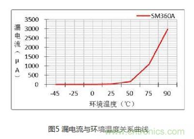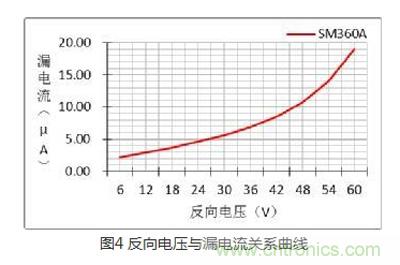 在二極管兩端加反向電壓時,其內(nèi)部電場區(qū)域變寬,有較少的漂移電流通過PN結(jié),形成我們所說的漏電流。漏電流也是評估二極管性能的重要參數(shù),二極管漏電流過大不僅使其自身溫升高,對于功率電路來說也會影響其效率,不同反向電壓下的漏電流是不同的,關(guān)系如圖4所示:反向電壓愈大,漏電流越大,在常溫下肖特基管的漏電流可忽略。