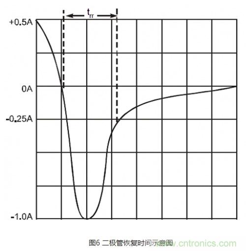 如圖6所示,二極管的反向恢復(fù)時間為電流通過零點由正向轉(zhuǎn)換成反向,再由反向轉(zhuǎn)換到規(guī)定低值的時間間隔,實際上是釋放二極管在正向?qū)ㄆ陂g向PN結(jié)的擴散電容中儲存的電荷。反向恢復(fù)時間決定了二極管能在多高頻率的連續(xù)脈沖下做開關(guān)使用,如果反向脈沖的持續(xù)時間比反向恢復(fù)時間短,則二極管在正向、反向均可導(dǎo)通就起不到開關(guān)的作用。PN結(jié)中儲存的電荷量與反向電壓共同決定了反向恢復(fù)時間,而在高頻脈沖下不但會使其損耗加重,也會引起較大的電磁干擾。所以知道二極管的反向恢復(fù)時間正確選擇二極管和合理設(shè)計電路是必要的,選擇二極管時應(yīng)盡量選擇PN結(jié)電容小、反向恢復(fù)時間短的,但大多數(shù)廠家都不提供該參數(shù)數(shù)據(jù)。