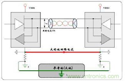 干擾不但影響信號,更嚴重的會導致板子死機或者燒毀,所以接口和電源的隔離是抗干擾的第一條“軍規(guī)”.隔離的主要目的是:避免地回流燒毀電路板和限制干擾的幅度,保護控制器不死機。如圖3所示,為未隔離時,兩個節(jié)點的地電位不一致,導致有回流電流,產(chǎn)生共模信號,CAN的抗共模干擾能力是-12~7V,超過這個差值則出現(xiàn)錯誤,如果共模差超過±36V,燒毀收發(fā)器或者電路板。