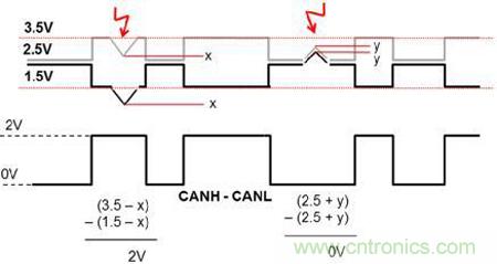 CAN總線為了提高抗干擾能力,采用CANH和CANL差分傳輸,達到效果就是遇到干擾后,可以“同上同下”,最后CANH-CANL的差分值保持不變。如圖7所示。