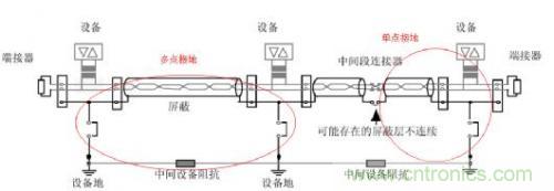 使用屏蔽線后,在屏蔽層沒有良好接大地前,屏蔽線是不起作用的。所以我們要選擇一種接地方式。通常來說,屏蔽層單點接地可以避免地回流(不同位置的地電位不同而導致的產(chǎn)生電流)、多點接地可以加快高頻干擾信號的泄放。所以要根據(jù)實際情況選擇合適的接地方式。如圖11所示。