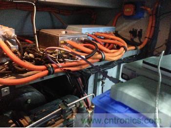 遠離干擾源是最簡單的抗干擾方法,如果CAN線與強電干擾源遠離0.5米,干擾就基本影響不到了。可是在實際布線中,經(jīng)常遇到空間太小而不得不和強電混在一起,如圖12所示,為某新能源汽車的驅(qū)動系統(tǒng),CAN線與驅(qū)動線混在一起,結(jié)果導致干擾很大。只要與CAN并行的驅(qū)動線,具備2A/秒的電流變化,就會耦合出強磁場而導致CAN線上出現(xiàn)干擾脈沖。所以CAN線必須要和電流會劇烈變化的線纜遠離。比如繼電器、電磁閥、逆變器、電機驅(qū)動線等。