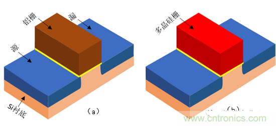MOS誕生之初,柵極材料采用金屬導體材料鋁,因為鋁具有非常低的電阻,它不會與氧化物發生反應,并且它的穩定性非常好。柵介質材料采用SiO2,因為SiO2可以與硅襯底形成非常理想的Si-SiO2界面。如圖1.13(a)所示,是最初鋁柵的MOS管結構圖。
