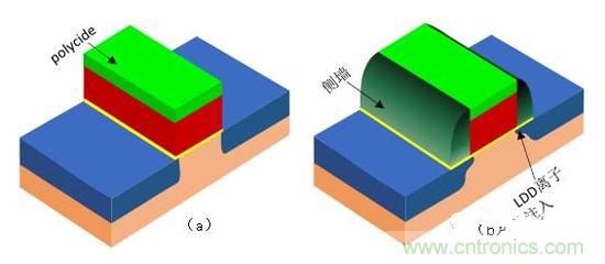 MOS器件的特征尺寸縮小到深亞微米導致的另外一個問題是短溝道效應引起的亞閾值漏電流。隨著MOS器件的柵極長度縮小到0.25um,源漏之間的耗盡區會相互靠近,導致它們之間的勢壘高度降低,形成亞閾值漏電流。雖然MOS器件的柵極長度從0.33um縮小到0.25um時,器件的工作電壓也從3.3V降低到2.5V,但是MOS器件的亞閾值區的漏電流依然很大。為了降低MOS器件的亞閾值區的漏電流,需要增加一道溝道離子注入和暈環(Halo)離子注入增加溝道區域的離子濃度,從而減小源漏與襯底之間的耗盡區寬度,改善亞閾值區的漏電流。如圖1.15(a)所示,進行溝道離子注入的MOS管結構圖。