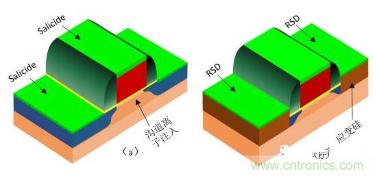 隨著MOS器件的特征尺寸不斷縮小到90nm及以下時,短溝道效應中的器件亞閾值電流成為妨礙工藝進一步發展的主要因素,盡管提高溝道摻雜濃度可以在一定程度上抑制短溝道效應,然而高摻雜的溝道會增大庫倫散射,使載流子遷移率下降,導致器件的速度降低,所以僅僅依靠縮小MOS器件的幾何尺寸已經不能滿足器件性能的提高,需要一些額外的工藝技術來提高器件的電學性能,例如應變硅技術。應變硅技術是通過外延生長在源漏區嵌入應變材料使溝道發生應變,從而提高載流子遷移率,最終提高器件的速度。例如NMOS的應變材料是SiC,PMOS的應變材料是SiGe。另外,隨著源漏的結深的短減小,源漏擴散區的厚度已經不能滿足形成Salicide的最小厚度要求,必須利用新技術RSD(Raise Source and Drain)技術來增加源漏擴散區的厚度。RSD技術是通過外延技術生長在源漏區嵌入應變材料的同時提高源漏擴散區的厚度。如圖1.15(b)所示,是采用應變硅和RSD技術的MOS管結構圖。