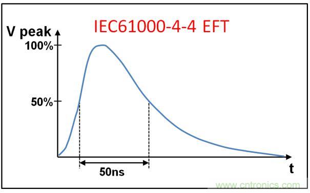 開關(guān)電路關(guān)聯(lián)的瞬變干擾,這類電路能夠以容性方式耦合至通信端口。EFT的纏上包括繼電器和開關(guān)觸點(diǎn)抖動(dòng),或者因?yàn)楦行曰蛉菪载?fù)載切換而產(chǎn)生的瞬變, 而所有這些在工業(yè)環(huán)境中都很常見。EC 61000-4-4中定義的 EFT測(cè)試,就是去模擬這些事件產(chǎn)生的干擾。