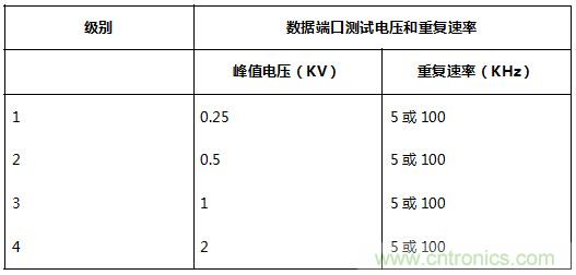 IEC 61000-4-4規(guī)定了不同環(huán)境狀況下的電壓測(cè)試級(jí)別,分為4級(jí)。同時(shí)規(guī)定了不同測(cè)試級(jí)別對(duì)應(yīng)的測(cè)試電壓和脈沖重復(fù)速率。