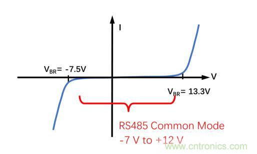 重要的是要確保TVS的擊穿電壓在受保護(hù)引腳的正常工作范圍之外。CDSOT23-SM712的獨(dú)有特性是具有+13.3 V和–7.5 V的非對(duì)稱擊穿電壓,與RS-485芯片ADM3485E的+12 V至–7 V的收發(fā)器共模范圍相匹配,從而提供最佳保護(hù),同時(shí)最大限度地減小對(duì)RS-485收發(fā)器的過壓應(yīng)力。