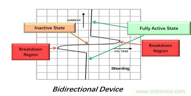TISP的非線性電壓-電流特性通過轉(zhuǎn)移產(chǎn)生的電流來限制過壓。作為晶閘管,TISP具有非連續(xù)電壓-電流特性,它是由于高電壓區(qū)和低電壓區(qū)之間的切換動(dòng)作而導(dǎo)致的。在TISP器件切換到低電壓狀態(tài)之前,它具有低阻抗接地路徑以分流瞬變能量,雪崩擊穿區(qū)域則導(dǎo)致了箝位動(dòng)作。