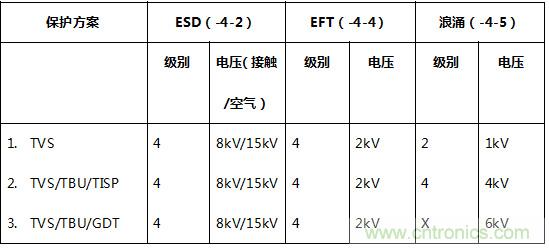 按照以上的規(guī)范要求和設(shè)計(jì)原則,下面我們提供三種不同級(jí)別的EMC防護(hù)解決方案,這些方案都已經(jīng)經(jīng)過了第三方獨(dú)立EMC兼容性測(cè)試的認(rèn)證。方案中用到的元器件包括: