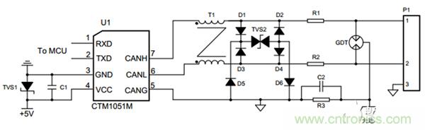圖2.隔離型CAN收發(fā)模塊及應(yīng)用電路