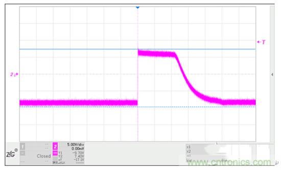 以SP00S12模塊為例,它可以滿足 IEC/EN61000-4-5 ±4KV 浪涌等級(jí)要求,可用于各種信號(hào)傳輸系統(tǒng),抑制雷擊、浪涌、過壓等有害信號(hào),對(duì)設(shè)備信號(hào)端口進(jìn)行保護(hù),非常適合于CAN、 RS-485 等通信領(lǐng)域的浪涌防護(hù)。以共模浪涌測(cè)試為例,在SP00S12輸入端加載4KV、 1.2/50μs 浪涌電壓(圖4),在輸出端測(cè)試壓降已被降低至17.1V(圖5)。