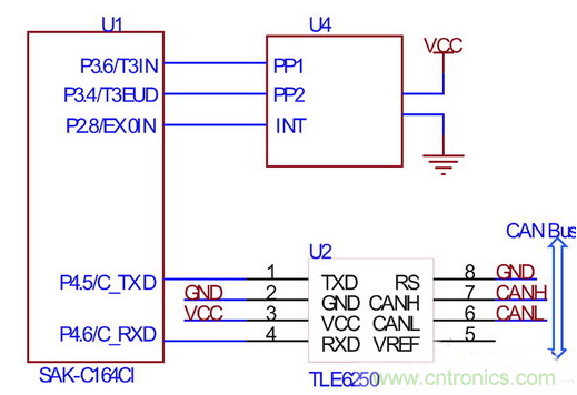 C164CI 與方向盤轉角傳感器的接口電路如圖2所示。片內內置增量編碼的正交解碼器,該解碼器使用定時器3的兩個引腳(T3IN、T3EUD)作為正交脈沖的輸入,在正確設置相關寄存器后,定時器3的數據寄存器的值與方向盤轉角成正比,故可方便的計算轉角,本文所使用的方向盤轉角傳感器每一圈對應44個脈沖,設定時器3的數據寄存器為T3,則絕對轉角為。