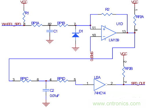 電路采用兩級濾波和整形,以保證輪速信號在極低轉速下不會丟失,同時避免因懸架振動引起的信號干擾。圖中由電阻R2引入第一級遲滯比較,而使用74HC14引入第二級遲滯比較。