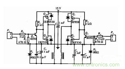 是由兩只p溝道MOSFET。Q1、Q2和兩只n溝道MOSFET Q5、Q6組成。在這里沒有采用4只n溝道MOSFET,原因是驅(qū)動電路復(fù)雜,如果采用上面的驅(qū)動電路接近電源的兩個導(dǎo)體管不能完全導(dǎo)通,發(fā)熱量為接近地一側(cè)導(dǎo)體管4倍以上,功耗增加,所以采用對管逆變即減小了功耗,而且驅(qū)動電路簡單。通過控制4個導(dǎo)體管的開關(guān)速度再通過低通濾波器即可實現(xiàn)DC/AC功能。
