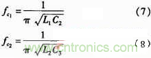 兩個肖特基整流二極管1N5822為續(xù)流二極管,這里為防止產(chǎn)生負(fù)電壓,C2、C3、C4、C5、L1、L2組成低通濾波器,其中C5、C6為瓷片電容,C2、C3用電解電容,充放電電流可以流進地,L1、L2為帶鐵芯的電感,帶鐵芯的電感對高頻的抑制比空心電感更好,電感值更高。關(guān)于參數(shù)的選取和截止頻率的計算如下