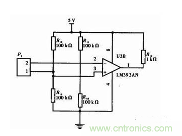 模擬比較器內(nèi)部偏置電流的10倍以上,電阻的阻值盡可能大,這樣既減小了功耗也保證了系統(tǒng)的穩(wěn)定性。Y3采用模擬比較器LM393,LM393內(nèi)部為開集電極輸出,應(yīng)用的時候輸出端要接一個上拉電阻,電路如圖3所示。