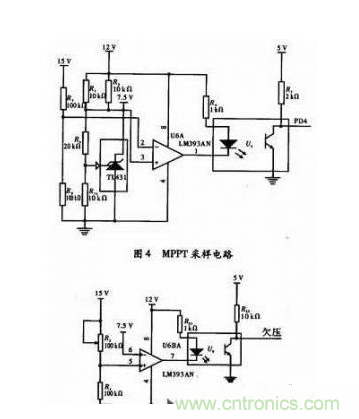 模擬比較器LM393的正相輸入端3腳位固定電壓7.5 V,正常狀態(tài)下PD4采集到的為高電平,當(dāng)2腳的電壓高于7.5 V時輸出端1腳輸出低電平,光耦導(dǎo)通,PD4采集到的為低電平開始處理SPWM信號調(diào)整輸出阻抗來實現(xiàn)恒電壓跟蹤,最終實現(xiàn)最大功率點跟蹤。電路如圖4所示。