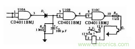 此部分電路的設(shè)計采用雙輸入四與非門CD4011做反相器、開關(guān)二極管D6、電阻R27、電解電容C10、三極管2N3904和繼電器。R26的選取由繼電器的驅(qū)動電流和2N3904的放大倍數(shù)β來決定,過小則增加功耗,過大則不能驅(qū)動繼電器。R27和C10的放電時間就是系統(tǒng)過流欠壓保護后檢測的間隔時間。時間T=2×R27×C10。